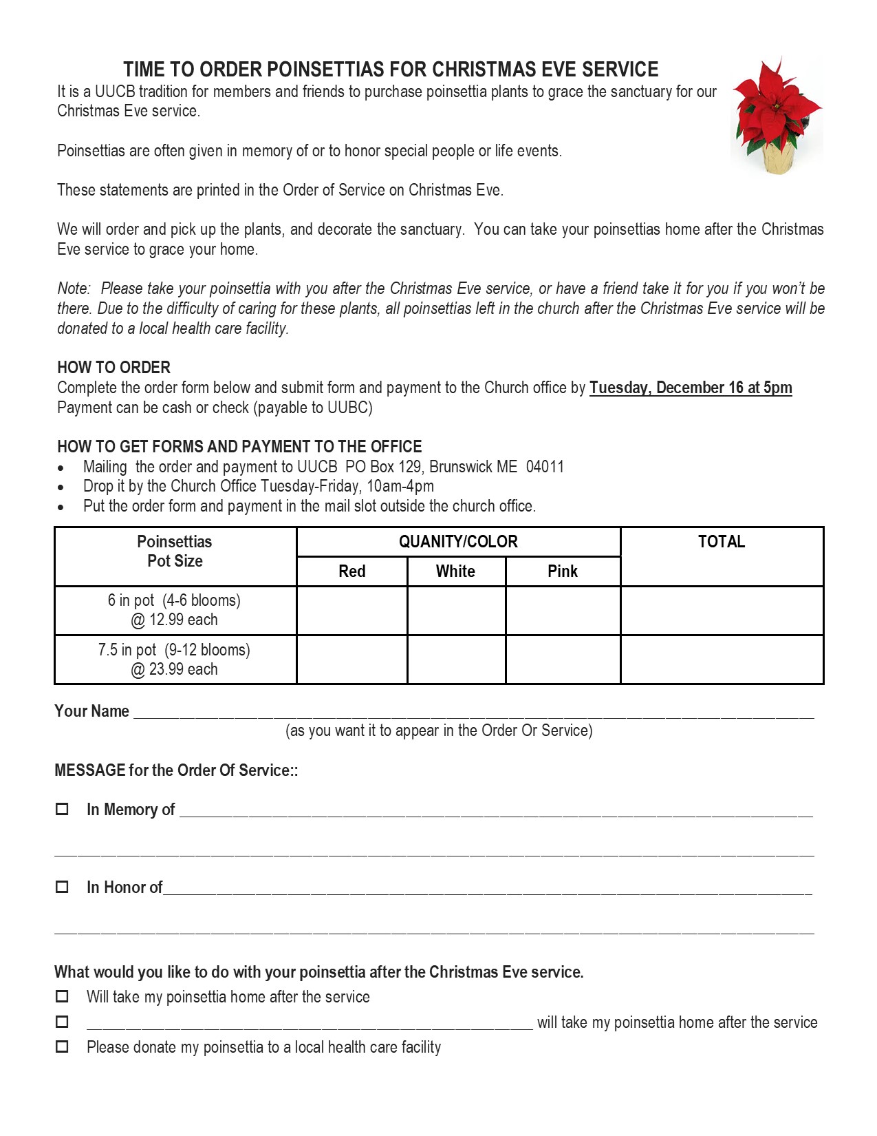 It is a UUCB tradition to for members and friends to purchase poinsettia plants to grace the sanctuary for our Christmas Eve service. Poinsettias are often given in memory of or in honor special people or life events. These statements are printed in the Order of Service on Christmas Eve.